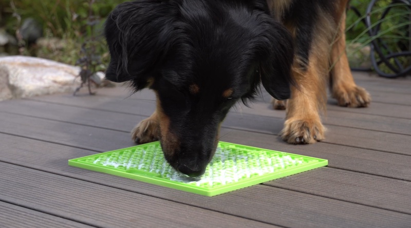Und Lecken reduziert Stress! Du kannst ihm die Matte in stressigen Momenten geben oder einfach zur langanhaltenden Beschäftigung.