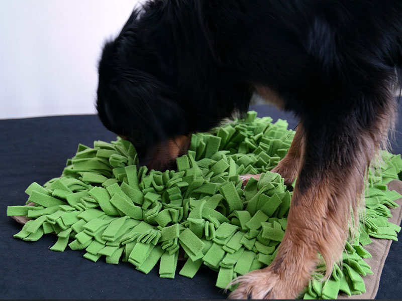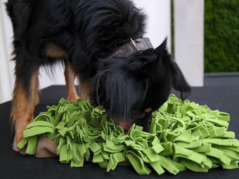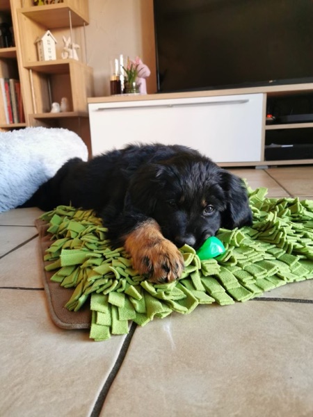 Sammy war schon mit drei Monaten vom Schnüffelrasen begeistert. Inzwischen sind die Futterstücke winzig klein, die darin versteckt sind und er hat eine Weile zu tun. Danach ist er rechtschaffen müde, ich kann ihn damit, er ist jetzt 9 Monate alt, gut auslasten, wenn das Wetter ein Rausgehen verhindert.
